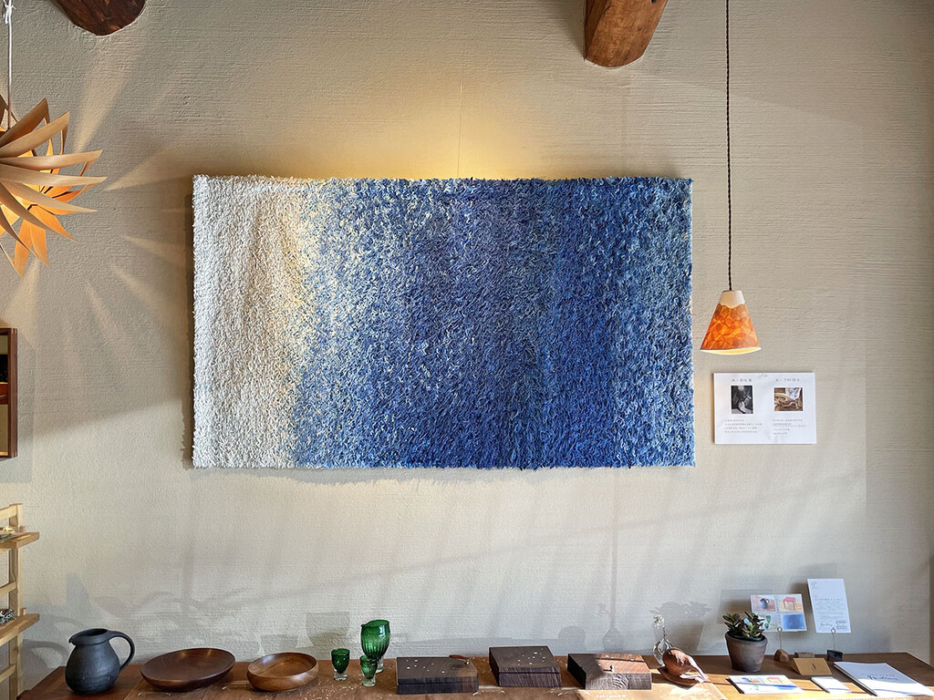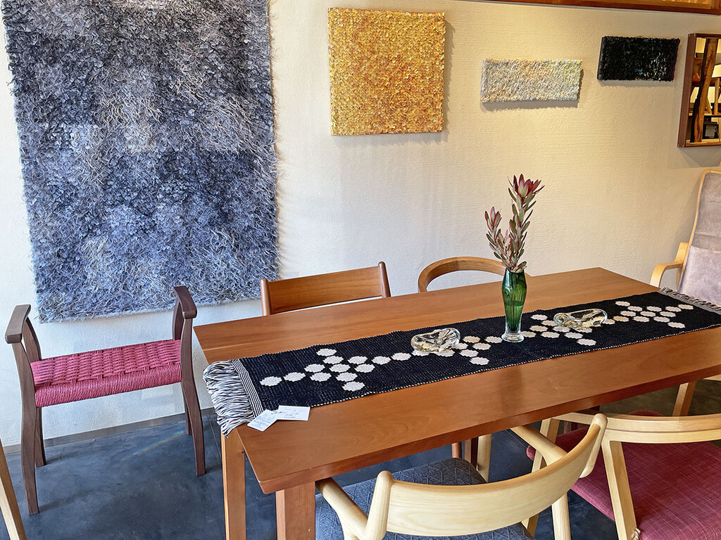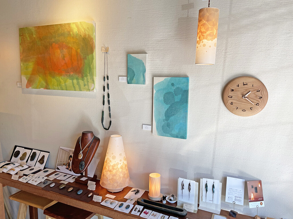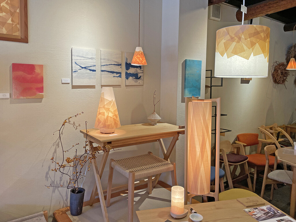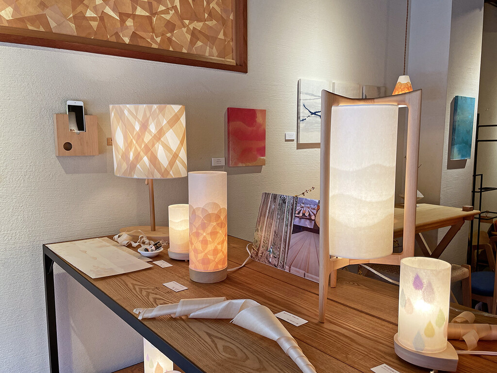 今回初めての展示だった和紙アートは、数は減ってしまいますがこれからも店内に。檜あかりと同じく普段からご覧いただけます。