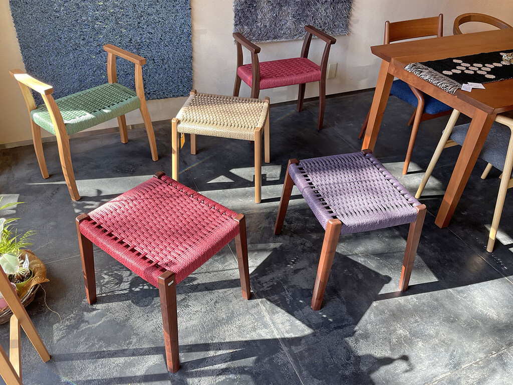 木の菊地さんは色染めしたペーパーコードのスツール。染め担当は好子さん、2人のコラボ作品です。生成りよりも重厚なイメージですが、重さは変わらずとても軽いです。手掛かり付きのスツールは玄関でも活躍してくれますよ。